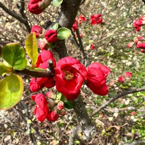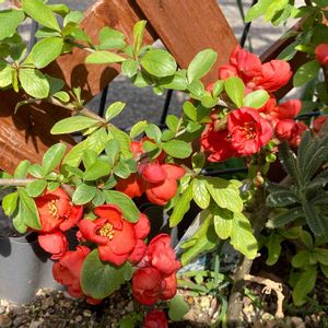 実家のボケのお花✨ まだ小さな木ですが、、、😊 満開です(^-^)v
