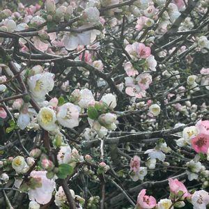 ボケの花 病院の花壇に薄ピンク・白と淡い色が綺麗に咲いてます