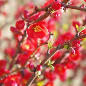 放春花 (ボケ) バラ科 1️⃣ 庭に3種類のボケの花があり。。。 1番咲きが真っ赤に綺麗に 咲き始めました🌹✨ 真っ赤な花で元気パワーを 貰えますᕕ( ᐛ )ᕗ❤️✨🍀