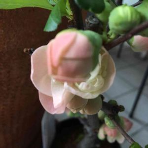 ボケの花が咲きました。 淡い色が可愛いです!😄