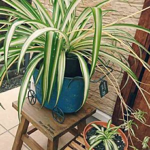 オリヅルラン。成長が早いですね(*´ω`*)この春に植え替えたのにもう鉢の下から根っこが出てます(;´д`) 凄い生命力!! その生命力に元気が貰える気がします(^^)