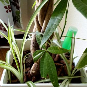 パキラの鉢にオリヅルランのこどもを植え込みました。スクスク育っています。