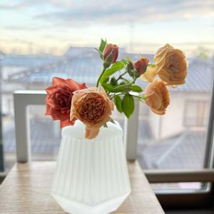 こんばんは🌃 ①②③またまたミニ薔薇 モカ 今朝、1輪咲きました✴️ あと一つ蕾があります😍 葉っぱは黄色くなってしまってるけど 頑張って綺麗に咲いてくれました ④台所のカウンターに置いた洋ナシ三兄弟🍐🍐🍐 可愛くてクスッ😆 実のなる木が欲しいな〜と思う今日この頃 イチジク?ブルーベリー🫐?ゆず?🤔 ⑤夕方5時の家からの空🌇 秋っぽいな〜 楽しい夜を🍻