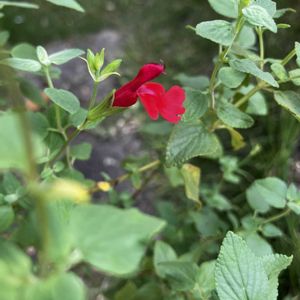 チェリーセージ ホットリップス🌸 気温によって花の色が変わるらしい… 気温高→赤 気温低→白 いまどっちも咲いてるのは?? 中間の気温ってことかな😄 3枚目: 植え替えたミニバラ・モカ 買ったときのままの白のプラ鉢 →ちょっとオシャレな鉢に植え替え✨ 鉢を変えただけでも雰囲気変わるね〜