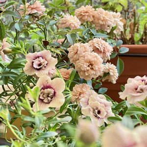 8月も終わりますね。まだまだ暑いのですが、もう秋になるのでミニバラの夏剪定をしようと思います☝️ その前に撮影📷 1️⃣タマラだけは玄関に。 4️⃣その他のベランダ組の様子。 以下、余談を。 ・今日のお花のギボウシを投稿したいのですが、夏越し中で映える写真はありません😅 ・我が家の庭、今年はコガネムシ🪲の幼虫🐛の食害が多い💦最近、緊急植え替えを2鉢しました😣 (植え替えたのはバラではなくて、ゼラニウムとヒューケラです)