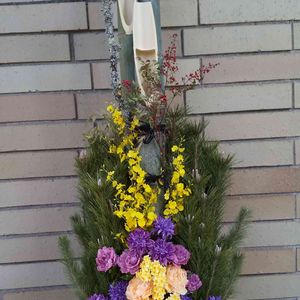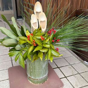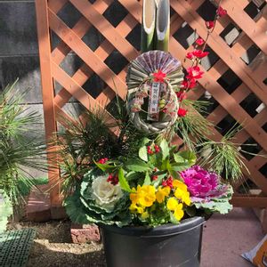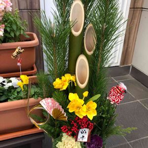ちょっとお正月には早いですが…。 過去のモノです。 NHKの「趣味の園芸」でやっていたものを真似て作りました。 竹をカットするのさえクリア出来れば割りと簡単だと思います。 ホームセンターで売っているモノよりも見栄えが良くて安く出来ます。 『園芸門松🎍』作ってみてはいかがでしょうか?😄🌿 追記 🌿🌿🌿🌿🌿🌿🌿🌿 子供がもっと小さい時に、ハロウィン🎃やクリスマス🎅も、もちろんgood👍ですが、日本の伝統的なものも見せてあげたい…という思いで作りました。 難しくはないので皆さまも是非! 〈作り方〉 必要なモノ 竹、しゅろ縄、松(3本位)、南天、葉牡丹、飾りもの、砂、鉢 事前に竹以外の必要なモノをHC等で揃えておく。 ①竹を手に入れる。 私は近くの竹林の持ち主を見つけて譲ってもらいました。竹は繁殖力が強く定期的に伐採する必要があるので喜んで譲ってくれると思います。長く伸びた竹2~3本位。運ぶのが大変なのでその場で3分割位にして車に入る長さに。 ②竹を斜めに切る ここが少し難ありですが、男性だったらまあ出来るのでは? 女性は近くにいる男性を巻き込んで手伝ってもらう。 普通のノコギリだと丁寧に出来ますが、電動ノコギリだと早いです。 節の所を切って、笑い竹(笑った様な切り目)にすると見た目も縁起も良い。 高低差をつけて6本作る。 ③切った竹を三本ずつ揃えてしゅろ縄などで縛る ④竹、松、飾りもの、葉牡丹、南天を鉢に入れて形を整え砂で隙間を埋める フラワーアレンジメントの要領でどこに何を配置するか考えるここが一番醍醐味で楽しい所かも。 ※隙間を埋めるのは土を使うと汚れ易いので、重さのある砂の方が良い様です。 以上で完成✨ この写真の鉢はダイソーで200円のものだったので、2つ作って材料費4000円弱位で出来ました。 一番高いのが南天ですが、家にある人は家のを使うと良いですよね🎶 後のケアとしては、鉢に水やりをする。 お正月が終わった後はバラして竹などは神社やどんど焼き(珍しい?)で燃やしてもらう。 根がある葉牡丹、南天等は植え直して楽しむ。です。 以上でした~🤗
