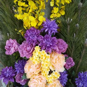 ちょっとおしゃれな門松🎍 ② アップにしてみました🤗 上は黄色いレンギョウかと。⇒オンシジウムに訂正 紫やピンクはダリア? 一番下濃紺はやはり葉牡丹でしょうか? 真ん中の黄色いのは…?