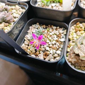 アボニア ⇐クイナリア 赤花 もう何年もいるのに一度も花を咲かせないコ ⇒ディンテリ 7月頃には花咲かせるだろうというので二和園から迎えた期待大なコ 植え替えました🎵 🌸