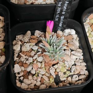 成長が遅いと言われているアボニアクイナリア(アルストニー)ですが、3年ほどでここまで成長しました。 植え替え当時はコマ型に育ってほしいと言っておりましたが、今見るとクサビ型になってますね。 最近は年がら年中花が咲いている印象で、本当に冬型多肉なのか疑問なのですが…皆さんはどう思われますでしょうか?