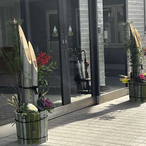 東京ガーデンテラス紀尾井町1階駐車場入口の装花と2階テナントの門松。