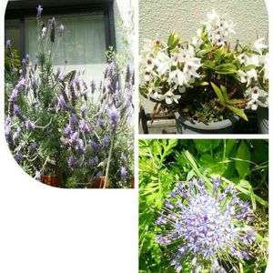 こんばんは~ 今日のご近所さんのお花♪ ラベンダーにアゲハチョウが!! 蜜を吸うのに夢中で、思わず激写(笑) 蘭と、下のパープルの花の名前はわかりません。 よく見る花ですが(* ̄∇ ̄*)