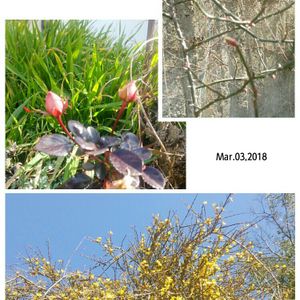 訪問先のご近所の空地にて~ バラの新芽と蕾♪ 黄色の花は、レンギョウかな?