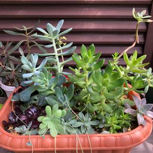 今日の2枚目。 ポイポイ鉢の徒長しすぎの多肉さん色々。 涼しくなったら✂️して植え替えかな?