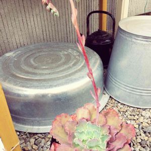 プラグ苗とダイソーサボ詰め合わせ。 子供が遊んでいたままごとセットを処分したときに、ホーローのちょっといいのはとっておきました。 かわいいし、多分高いし(^_^;) それにガンガン底穴を開けて再利用。かわいい!あんまりうちにないテイストやけど!