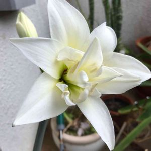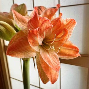 ほぼ日アマリリス番外編 自分のと一緒に買って母にあげたアマリリス(名前忘れた😅) 凍らせないようにと袋被せてあったたため(実家行った時私が取りました)大幅に成長が遅れましたが、開花の連絡が❣️ 八重で華やかだけど優しい色のお姫様です✨✨ うちの子は雄蕊6本だったんだけどこの子は3本?かな?同じアマリリスなのに不思議(*´︶`*)❤︎
