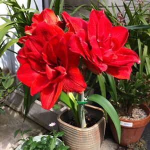 アマリリス 今年は2種類咲きました❤️ 八重咲きは赤が鮮やか❤️