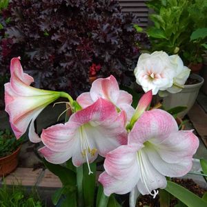 この子は本当に 可愛くって、綺麗に 咲いてくれます。後ろの八重咲きも綺麗 なんですけれど、残念 😄 前のアマリリスには負けます。 ヒューケラも黒葉で艶やかで素敵 ✨✨✨