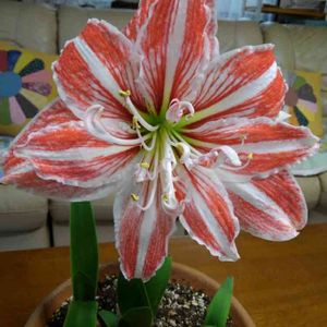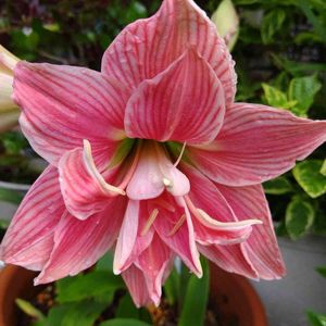 アマリリス、大きなお花が咲きましたよ〜😆😆😆 シャンティ❷ さんからいただいた子、やっと今年は咲いてくれました‼️ こんなに大きなお花が咲いてくれると、明るい気持ちになりますね✨✨