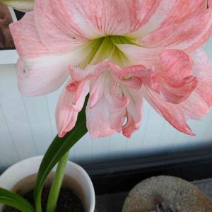こんにちは😊 また昼から☔️模様😰 ベランダでアマリリスが咲いてました❣️ 昨年は咲いてくれず、 球根も一回り小さくなった様な💦 花も2つしかついてないし 色も薄いです。 花後は球根を充実させないと…😅