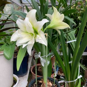 狂い咲きのアマリリス 花を二つ咲かせちゃった どちらも綺麗に咲いてくれたけどー 春は咲くのか?