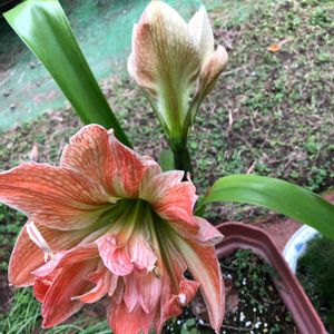 八重のアマリリスがまた咲いちゃった💦 今年2回目です 5月下旬に咲いて そろそろ軒下にと考えてたのに咲いちゃった😫 春にまた咲いてくれるの? 困ったちゃんです😭