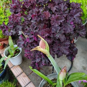 八重咲きアマリリスが 開きそう~🎵 メクって見たい~ 😁ウズウズ 😅 ヒューケラの花は何色か 分かりません ❓️ ここまで育ってくれたのは初めてです。 嬉しい 🎵😍🎵