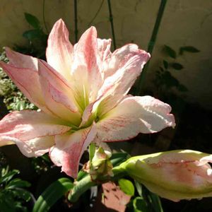 昨年近所の方から頂いた八重薄いピンクの アマリリス 毎日pic🤳していました。 やっと開花💕🥰 藤の種 水につけて芽🌱をだしてから、土に。いいのかな?