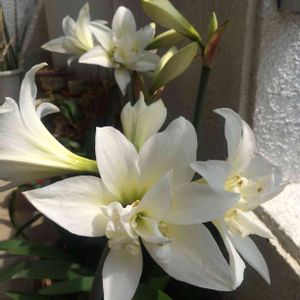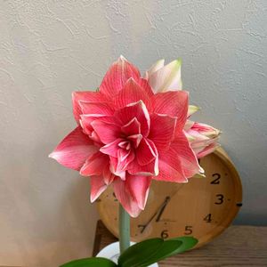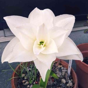 母が大切?に育てているアマリリス。今年はアマリリスの中で一番最初に白の八重が咲きました。 茎は短いけど大きな花で、蕾があと2つあります。 これから他のも咲くと思うと楽しみ~(≧▽≦)