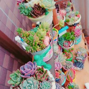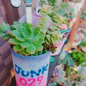 ツナ缶コンビ♡ 葉挿しの虹の玉が もさもさして来た( *'ω'*)و グッ その反面 箱庭風に寄せ植えしたのは ジャングルと化した この時期成長早いわー 止まらねえぇぇ :((っ°ө°c)):ブルブル