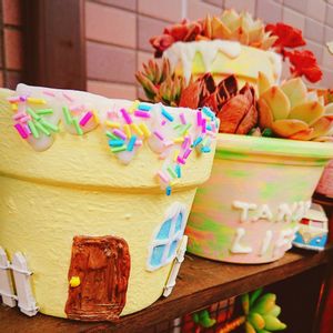 まだ未完成だけど お菓子の家っぽいリメ鉢 製作中 ┌('ω'」∠)_ズリズリ 右側みたいに 重ね鉢にしようか そのまま使うか( ˘ω˘ )ウーム