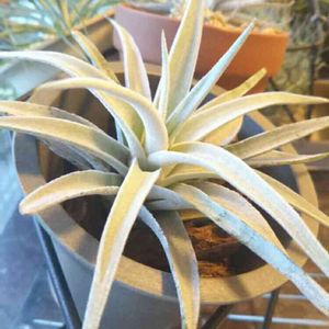 チランジア・ガルドネリ・ルピコラ 短垂れ葉個体 Tillandsia gardneri var. rupicola 今日の1日1チラUP ガルドネリ ルピコラさん 見た目と違い以外に水を好みます。水をたっぷり与える水やりを心がけると調子良さそうに見えます。ブラジルのリオデジャネイロ州、カボフリオの近郊の海岸部で自生しているらしく、塩害耐性もあるのこと。この子は通常のガルドネリより葉が厚く短いコンパクトタイプで野生採取株由来のもの。そのせいか、基本種は栽培難種として有名ですが、変種のルピコラは強健で、比較的育てやすいと言われています。 花が咲きづらいのと増やすのが難しい種らしいので、積極的に咲かせたい気持ちあるけど、しばらくはこの美しい草姿も楽しみたいんだよな〜w😅 せっかくだから「白色植物」コンテストに応募しとこ〜✨ チランジア白虎隊(`_´)ゞよろしく!