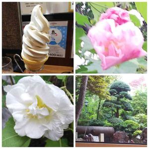 火曜日に行った戸栗美術館のお庭(撮影禁止😅)と途中にあったお稲荷さんに咲いてた酔芙蓉🎵 昼代りに食べたモカミックスのソフトクリーム🍦