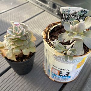 うちの新入り2つ とっても整ったエケベリアと、 2枚目、 モサモサ大好き😊な私が一目惚れ🤩これ、エケベリアなんだって‼︎