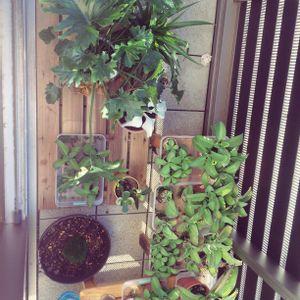 自室の窓辺用に棚を製作。釘を使うと部屋から出し入れできないのでダボを打ち込むタイプの組み立て式に。 各段の板は、日当たり調整などをしたいので簡単に取り外し可能に。ほんと乗せてるだけ。 日当たりの悪くなる下段は収納スペースや葉挿しやら挿し芽に使用。 よ~し頑張って棚を埋めるぞ 画面奥が窓、画像左が正面、右が別角度
