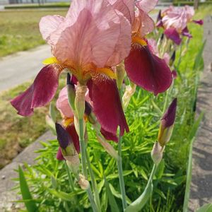 ジャーマンアイリス(アヤメ科アヤメ属) 別名ドイツアヤメ 田んぼの脇に植えてあるジャーマンアイリスが綺麗でした。 ジャーマンアイリスは虹の花(レインボーフラワー)とも呼ばれるように、色とりどりの花を咲かせ、アイリスの仲間では最も華やかで、非常に多くの品種があります。ヨーロッパに野生する自然交雑種ゲルマニカをもとにして、ほかのいくつかの原種も取り入れて交配育成が行われた系統です。