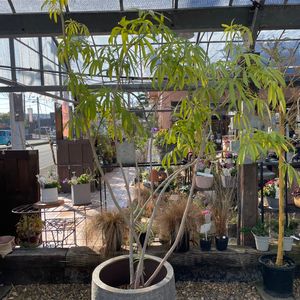 植物名:シェフレラ アンガスティフォリア 科名:ウコギ科 属名:シェフレラ属 原産:東南アジアなど [サイズ] 全体の高さ:98.0cm 全体の幅 :70.0cm 鉢の高さ :24.0cm 鉢の幅 :28.0cm 皿の直径 :25.5cm 皿の素材 :アイアン(防サビ加工) [育て方] 日当たり:日向~半日陰 水やり :土が乾いた頃に、底穴から水が抜けるくらいたっぷりと。受け皿に水はためないように。 置き場所:風通しの良い明るい場所(夏の直射日光は避ける) 耐寒温度:5℃ 観葉植物のなかでも丈夫で育てやすいシェフレラの仲間ですが、 とくにアンガスティフォリアは艶のある細長い美しい葉が特徴です。 石を削り出したような質感のセメントポットにコーディネート。 植物の鮮やかさが際立つ相性の良い組み合わせです。インテリアのポイントになるひと鉢です。 直射日光を避け、レースのカーテン越しの柔らかい光が差し込む置き場所が好ましいです。 土が湿っているときは水を与えず、土の表面がしっかり乾いてから水やりをするのが、 この美しい葉を保つコツです。