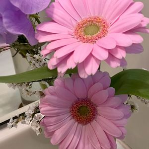 おはよーさん🤗💕 ピンクのガーベラ&スイトピー💐 powder roomにどーぞ❣️