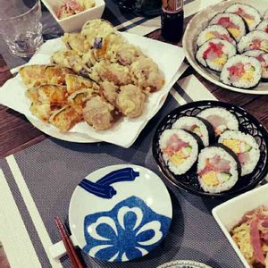 食卓から失礼を、、家庭菜園の秋ナス、カボチャ、実家の椎茸を天ぷらにしました。海鮮巻き寿司は十八番。