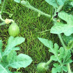 畑より⭐️メロンの実が膨らんできたー。葉は病気にやられ気味だけど、収穫までもつといいな😅
