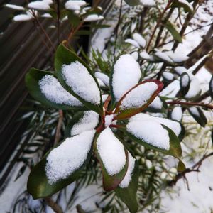 昨夜の雪は、強風のためか さほど積もりはしなかった。 風が弱まってから降ったのか、 お行儀よく葉っぱに収まった雪。 お寿司食べたいな・・・