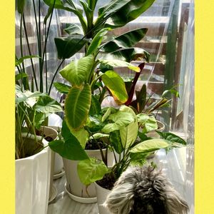 🌈バナナを愛でるワン🐕🦺🌈 今日もお日様満開🌞 冬の間 室内におわしたバナナ wood deckに お引越し❣️ 最初葉っぱ何枚目って数えてだけど 結構次々新葉っぱ出るんで おっつかへんなった。。笑 背丈も大きくなってきて したからジュニアも4本 今のところ 順調⁈なんかなぁ。。 なぜか オジィがお座りして バナナを眺めて動かない。。。 こやつ バナナ🍌好きやったっけ???