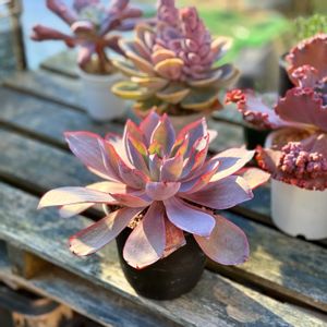 室内に取り込んだ多肉たちに日がさしていると可愛く見える不思議🤭 一部雨に濡れてしまった後で乾いていなかったので、気休め程度に扇風機の風を当てています🌬️ アエオニウムのピンクウィッチさん、買ってきてから一度も植え替えていないので早く植え替えてあげたいとおもいつつ、後回しに💦 福だるま(ふっくら娘)は意外と雨ざらしでもむっちむちに育っています。 アフターグローとオパリナは大丈夫なのか!?って感じの開き具合と色味になっています💦 キレイなんだけど、心配💦💦 寄せ植えは末期なので、天気が落ち着いたら解体か仕立て直しをしたいな〜