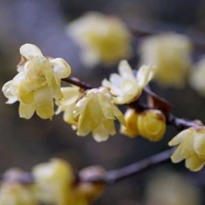 春の訪れを 予感させて くれる香り高い花💛 素心蝋梅の変種 花びらに丸みがあり 花色が一般的な素心蝋梅 より 黄色が濃い🟡 満月蝋梅(まんげつろうばい ロウバイ科