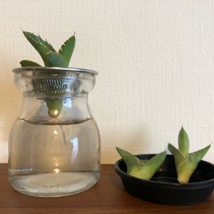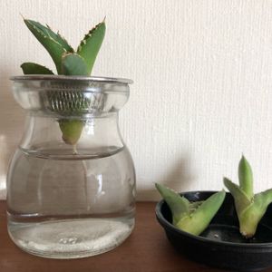 アガベ チタノタ水挿し8日目。断面が水面から離れるようにしてみました。根は一日に3mmくらい伸びてるので、週末まで待っての植え替えじゃ遅い気がしてきました。