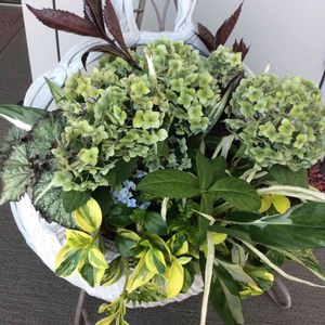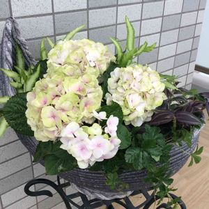 綱木紋の三日月にアジサイを寄せ植えしました。