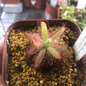 D.graminifolia 置き場所の関係で葉が歪んでますが、腺毛も真っ赤で肉厚な葉を出しているので順調です。