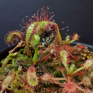 Drosera madagascariensisさんとちゃっかり生えてたDrosera capensis white flw. x aliciaeさん(以下c&a)の鉢もカラカラ事件から立ち直ってくれました。 って投稿しようと撮影してたらc&aの葉が全部中心にくるっとなってることに気付きました。 何でかな?と思って良く見たら、ギャー! 次回へ続く