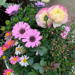 ピンクのホイップみたいなラナンキュラスとマーガレットストロベリーホイップ🍓に合わせたピンク色の寄せ植えです☺️ 真ん中にピンクのオステオスペルマム、その前にピンクのミニバラ🌹ピンクのデァアスキアダーラと羽衣ジャスミンで動きを出しました🌿