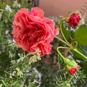 おはようございます(❁´ω`❁) かおりかざりさん昨日の強風で頭が重すぎて枝が半分折れてしまいました💦 (´;ω;`) 朝、時間がなかったのでローズマリーさんに支えてもらいました(*´˘`*)♡︎ 蕾も咲いてくれると嬉しい💓💞 今日も一日頑張りましょう٩(ˊᗜˋ*)و