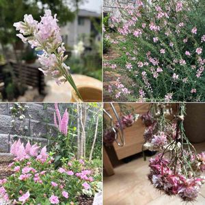 ピンクのラベンダーに ピンクのリナリア ピンクのカリブラコア ピンクのベロニカ ピンクのロータス おまけで、セルリアのドライ中〜 ラベンダーは部屋が香ります💜 オレガノとかはドライになりやすいんですってー。やってみよー ピンク😅 なんでしょう。どきどきしますね。。 不整脈!?😆